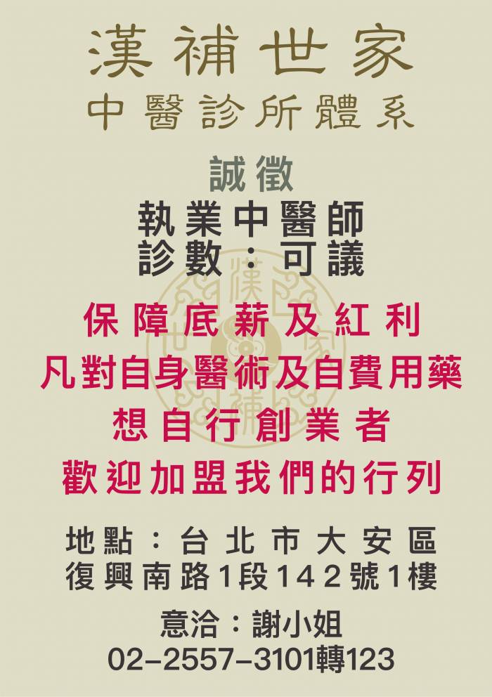 | 台北市中医师公会 官网:http://www.tpcma.org.tw 地址:台北市中正区青岛西路11号3楼 E-mail:tp.cma@msa.hinet.net 电话:(02)2314-3456(代表号) 传真:(02)2314-8181 |