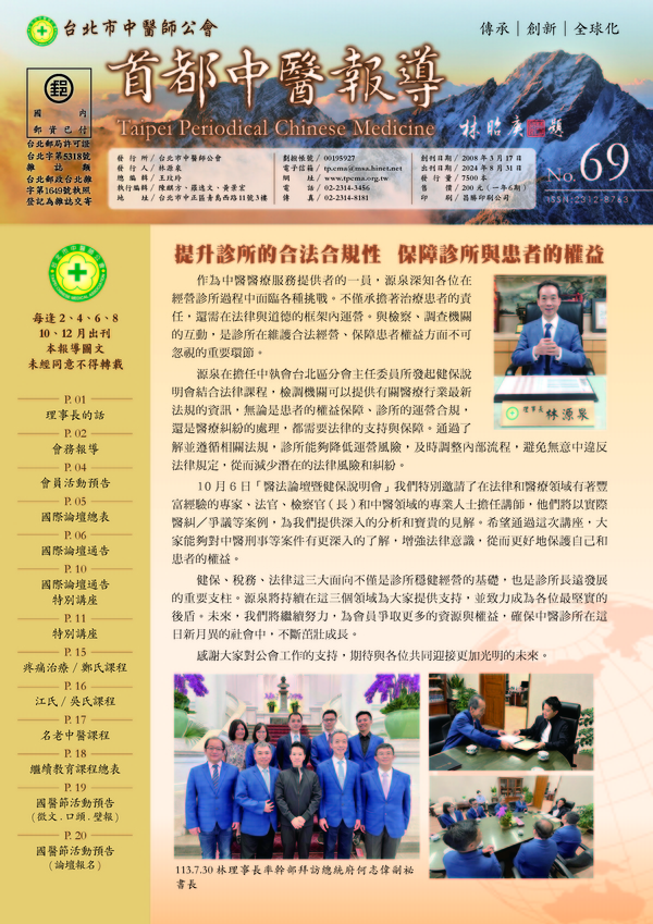 | 台北市中医师公会 官网:http://www.tpcma.org.tw 地址:台北市中正区青岛西路11号3楼 E-mail:tp.cma@msa.hinet.net 电话:(02)2314-3456(代表号) 传真:(02)2314-8181 |