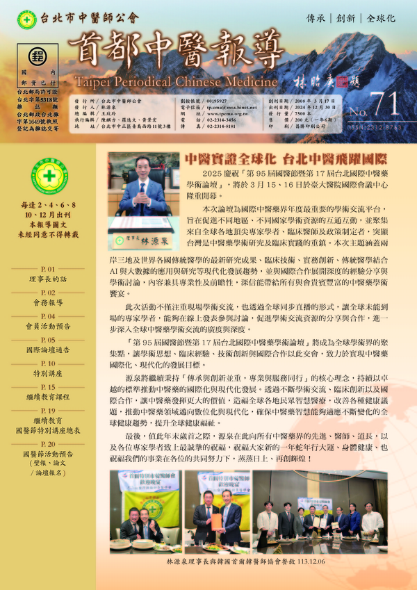 | 台北市中医师公会 官网:http://www.tpcma.org.tw 地址:台北市中正区青岛西路11号3楼 E-mail:tp.cma@msa.hinet.net 电话:(02)2314-3456(代表号) 传真:(02)2314-8181 |