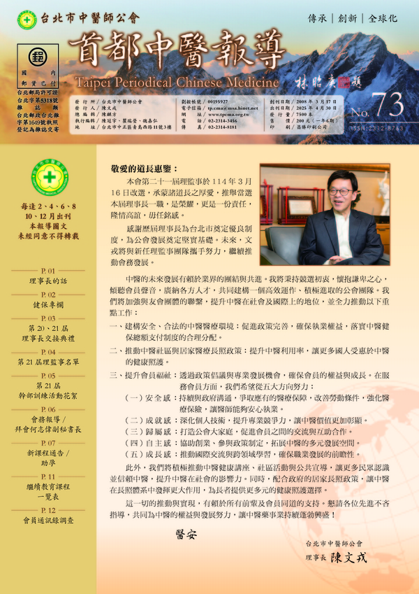 | 台北市中医师公会 官网:http://www.tpcma.org.tw 地址:台北市中正区青岛西路11号3楼 E-mail:tp.cma@msa.hinet.net 电话:(02)2314-3456(代表号) 传真:(02)2314-8181 |