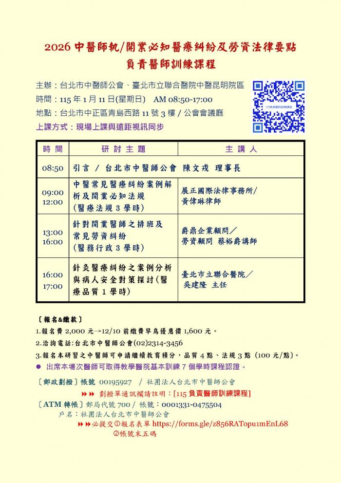 | 台北市中医师公会 官网:http://www.tpcma.org.tw 地址:台北市中正区青岛西路11号3楼 E-mail:tp.cma@msa.hinet.net 电话:(02)2314-3456(代表号) 传真:(02)2314-8181 |