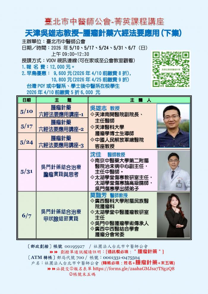 | 台北市中医师公会 官网:http://www.tpcma.org.tw 地址:台北市中正区青岛西路11号3楼 E-mail:tp.cma@msa.hinet.net 电话:(02)2314-3456(代表号) 传真:(02)2314-8181 |