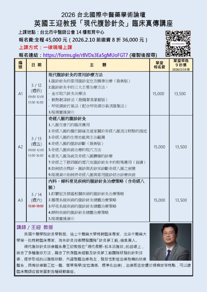 | 台北市中医师公会 官网:http://www.tpcma.org.tw 地址:台北市中正区青岛西路11号3楼 E-mail:tp.cma@msa.hinet.net 电话:(02)2314-3456(代表号) 传真:(02)2314-8181 |