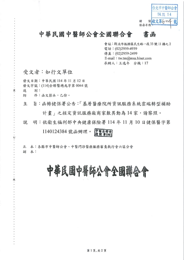 | 台北市中医师公会 官网:http://www.tpcma.org.tw 地址:台北市中正区青岛西路11号3楼 E-mail:tp.cma@msa.hinet.net 电话:(02)2314-3456(代表号) 传真:(02)2314-8181 |