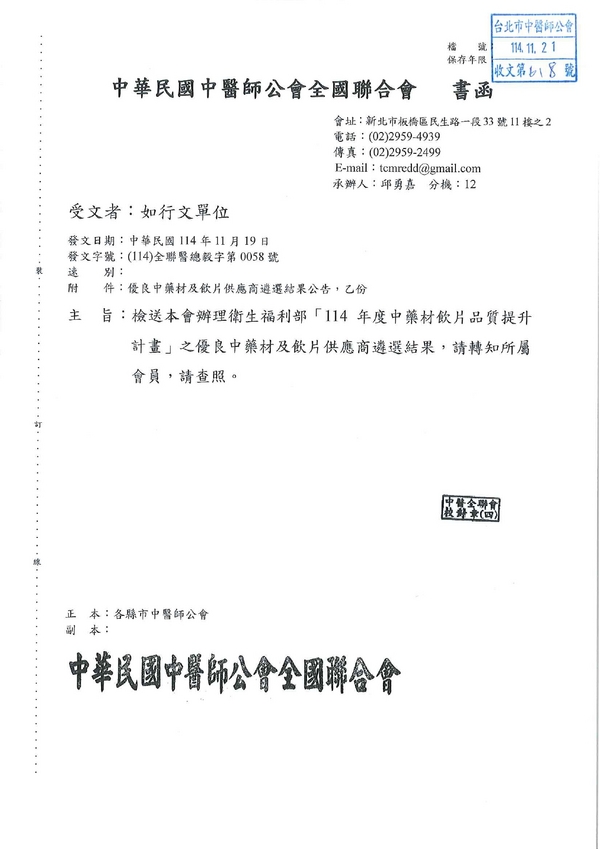 | 台北市中医师公会 官网:http://www.tpcma.org.tw 地址:台北市中正区青岛西路11号3楼 E-mail:tp.cma@msa.hinet.net 电话:(02)2314-3456(代表号) 传真:(02)2314-8181 |