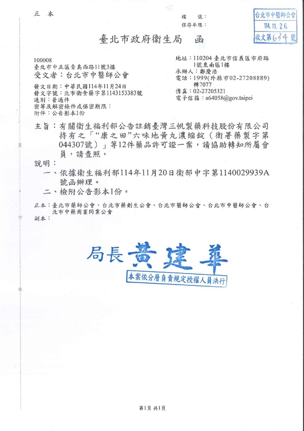 | 台北市中医师公会 官网:http://www.tpcma.org.tw 地址:台北市中正区青岛西路11号3楼 E-mail:tp.cma@msa.hinet.net 电话:(02)2314-3456(代表号) 传真:(02)2314-8181 |