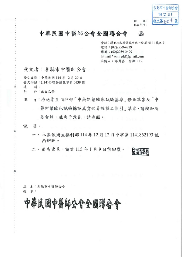 | 台北市中医师公会 官网:http://www.tpcma.org.tw 地址:台北市中正区青岛西路11号3楼 E-mail:tp.cma@msa.hinet.net 电话:(02)2314-3456(代表号) 传真:(02)2314-8181 |