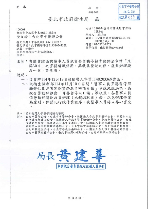 | 台北市中医师公会 官网:http://www.tpcma.org.tw 地址:台北市中正区青岛西路11号3楼 E-mail:tp.cma@msa.hinet.net 电话:(02)2314-3456(代表号) 传真:(02)2314-8181 |