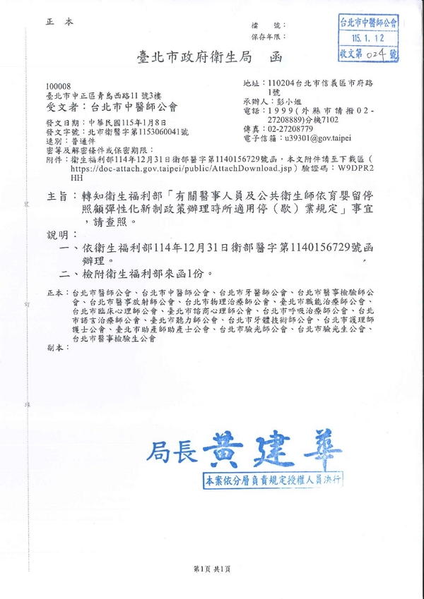 | 台北市中医师公会 官网:http://www.tpcma.org.tw 地址:台北市中正区青岛西路11号3楼 E-mail:tp.cma@msa.hinet.net 电话:(02)2314-3456(代表号) 传真:(02)2314-8181 |