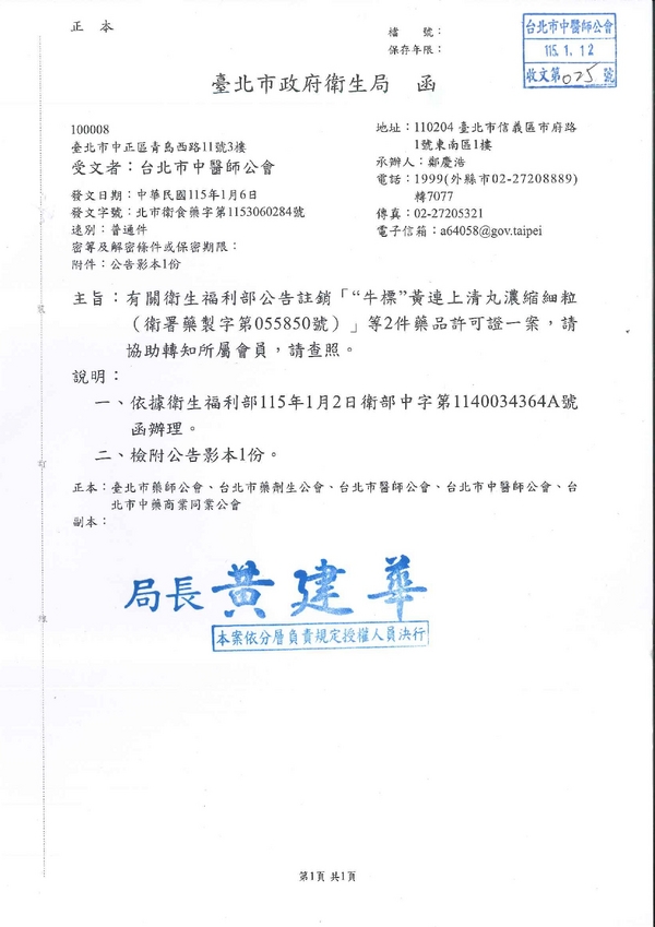 | 台北市中医师公会 官网:http://www.tpcma.org.tw 地址:台北市中正区青岛西路11号3楼 E-mail:tp.cma@msa.hinet.net 电话:(02)2314-3456(代表号) 传真:(02)2314-8181 |
