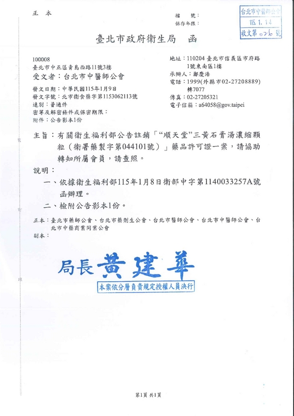 | 台北市中医师公会 官网:http://www.tpcma.org.tw 地址:台北市中正区青岛西路11号3楼 E-mail:tp.cma@msa.hinet.net 电话:(02)2314-3456(代表号) 传真:(02)2314-8181 |