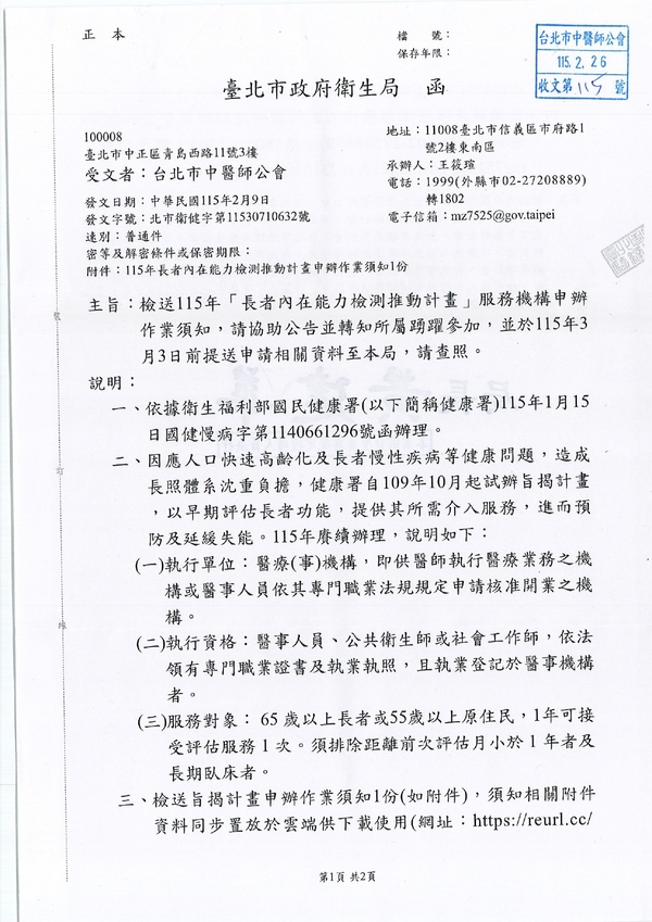 | 台北市中医师公会 官网:http://www.tpcma.org.tw 地址:台北市中正区青岛西路11号3楼 E-mail:tp.cma@msa.hinet.net 电话:(02)2314-3456(代表号) 传真:(02)2314-8181 |