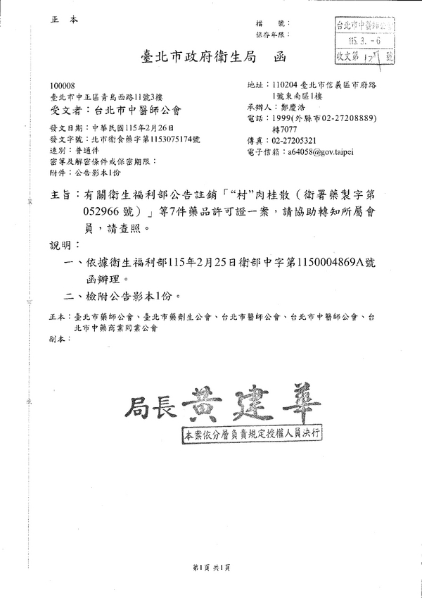 | 台北市中医师公会 官网:http://www.tpcma.org.tw 地址:台北市中正区青岛西路11号3楼 E-mail:tp.cma@msa.hinet.net 电话:(02)2314-3456(代表号) 传真:(02)2314-8181 |