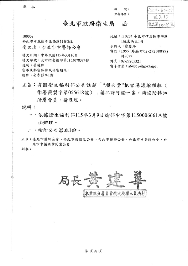 | 台北市中医师公会 官网:http://www.tpcma.org.tw 地址:台北市中正区青岛西路11号3楼 E-mail:tp.cma@msa.hinet.net 电话:(02)2314-3456(代表号) 传真:(02)2314-8181 |