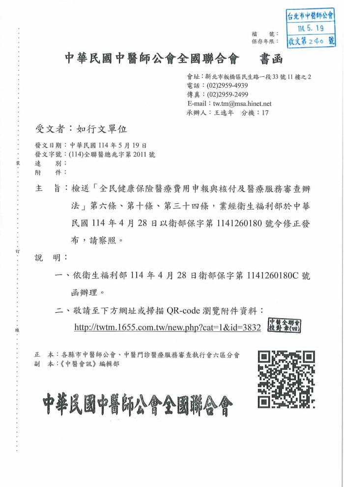 | 台北市中医师公会 官网:http://www.tpcma.org.tw 地址:台北市中正区青岛西路11号3楼 E-mail:tp.cma@msa.hinet.net 电话:(02)2314-3456(代表号) 传真:(02)2314-8181 |