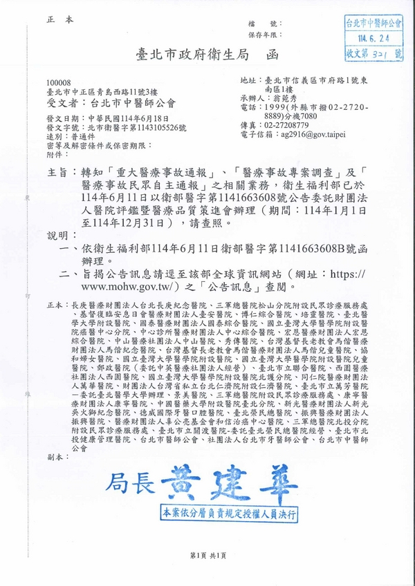 | 台北市中医师公会 官网:http://www.tpcma.org.tw 地址:台北市中正区青岛西路11号3楼 E-mail:tp.cma@msa.hinet.net 电话:(02)2314-3456(代表号) 传真:(02)2314-8181 |