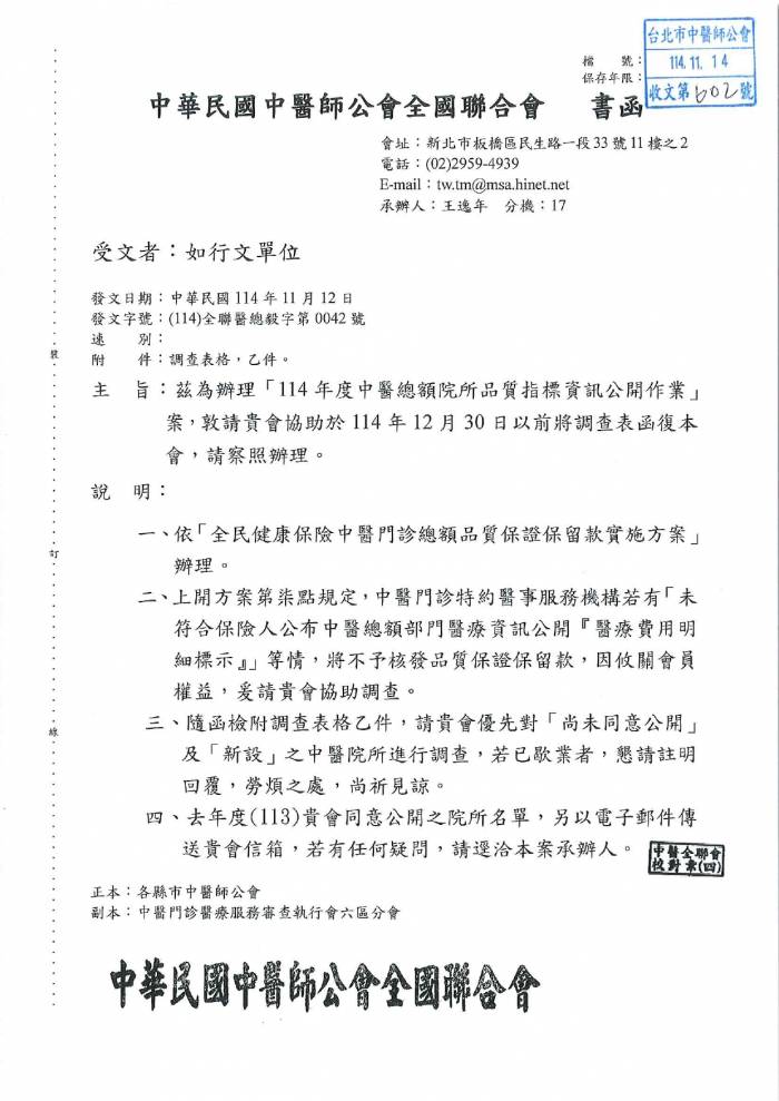 | 台北市中医师公会 官网:http://www.tpcma.org.tw 地址:台北市中正区青岛西路11号3楼 E-mail:tp.cma@msa.hinet.net 电话:(02)2314-3456(代表号) 传真:(02)2314-8181 |