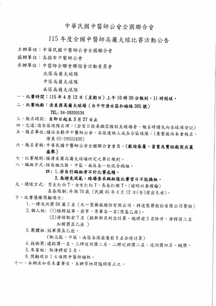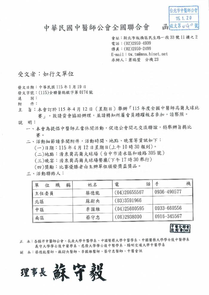 | 台北市中医师公会 官网:http://www.tpcma.org.tw 地址:台北市中正区青岛西路11号3楼 E-mail:tp.cma@msa.hinet.net 电话:(02)2314-3456(代表号) 传真:(02)2314-8181 |