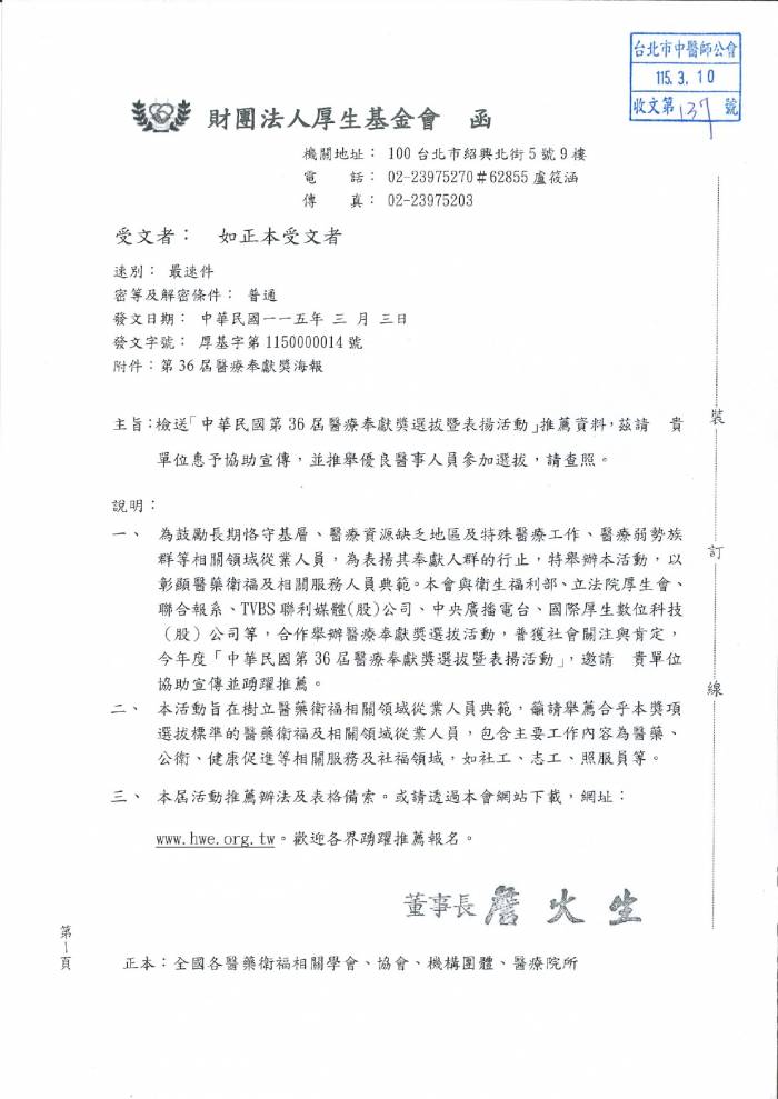 | 台北市中医师公会 官网:http://www.tpcma.org.tw 地址:台北市中正区青岛西路11号3楼 E-mail:tp.cma@msa.hinet.net 电话:(02)2314-3456(代表号) 传真:(02)2314-8181 |
