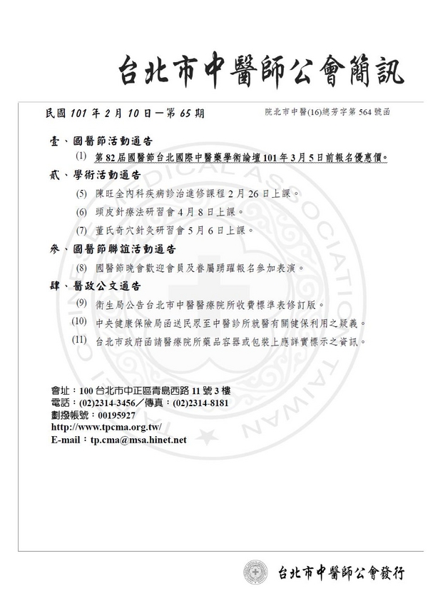 | 台北市中医师公会 官网:http://www.tpcma.org.tw 地址:台北市中正区青岛西路11号3楼 E-mail:tp.cma@msa.hinet.net 电话:(02)2314-3456(代表号) 传真:(02)2314-8181 |