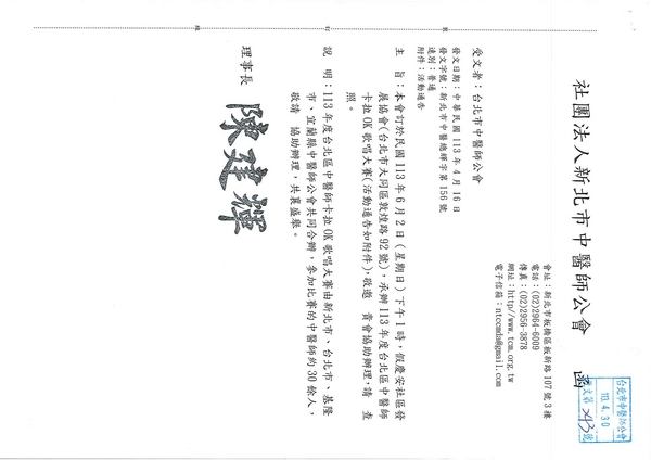 | 台北市中医师公会 官网:http://www.tpcma.org.tw 地址:台北市中正区青岛西路11号3楼 E-mail:tp.cma@msa.hinet.net 电话:(02)2314-3456(代表号) 传真:(02)2314-8181 |
