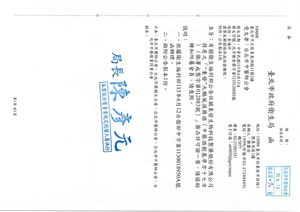 | 台北市中医师公会 官网:http://www.tpcma.org.tw 地址:台北市中正区青岛西路11号3楼 E-mail:tp.cma@msa.hinet.net 电话:(02)2314-3456(代表号) 传真:(02)2314-8181 |