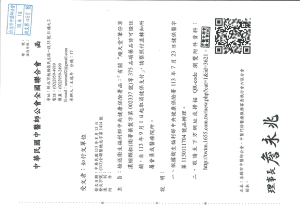 | 台北市中医师公会 官网:http://www.tpcma.org.tw 地址:台北市中正区青岛西路11号3楼 E-mail:tp.cma@msa.hinet.net 电话:(02)2314-3456(代表号) 传真:(02)2314-8181 |