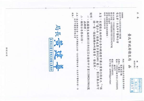 | 台北市中医师公会 官网:http://www.tpcma.org.tw 地址:台北市中正区青岛西路11号3楼 E-mail:tp.cma@msa.hinet.net 电话:(02)2314-3456(代表号) 传真:(02)2314-8181 |