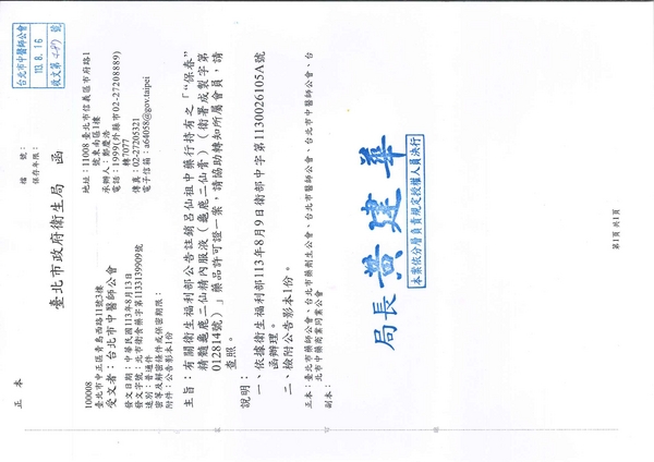| 台北市中医师公会 官网:http://www.tpcma.org.tw 地址:台北市中正区青岛西路11号3楼 E-mail:tp.cma@msa.hinet.net 电话:(02)2314-3456(代表号) 传真:(02)2314-8181 |