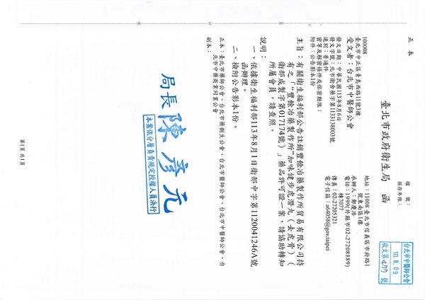 | 台北市中医师公会 官网:http://www.tpcma.org.tw 地址:台北市中正区青岛西路11号3楼 E-mail:tp.cma@msa.hinet.net 电话:(02)2314-3456(代表号) 传真:(02)2314-8181 |