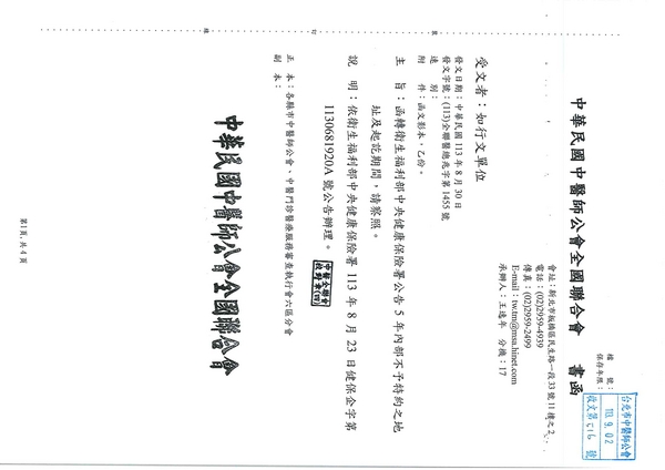 | 台北市中医师公会 官网:http://www.tpcma.org.tw 地址:台北市中正区青岛西路11号3楼 E-mail:tp.cma@msa.hinet.net 电话:(02)2314-3456(代表号) 传真:(02)2314-8181 |