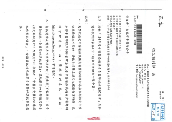| 台北市中医师公会 官网:http://www.tpcma.org.tw 地址:台北市中正区青岛西路11号3楼 E-mail:tp.cma@msa.hinet.net 电话:(02)2314-3456(代表号) 传真:(02)2314-8181 |