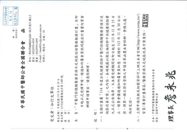 | 台北市中医师公会 官网:http://www.tpcma.org.tw 地址:台北市中正区青岛西路11号3楼 E-mail:tp.cma@msa.hinet.net 电话:(02)2314-3456(代表号) 传真:(02)2314-8181 |