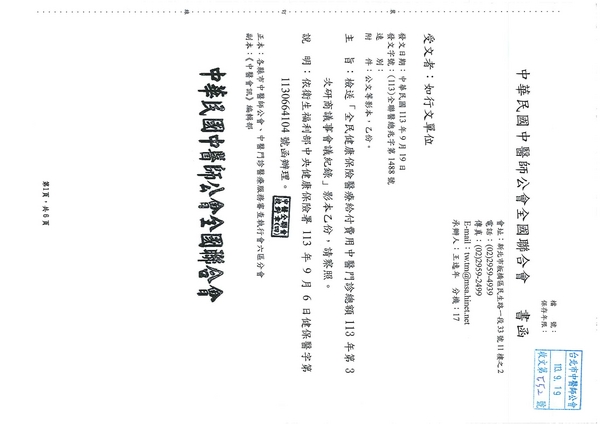| 台北市中医师公会 官网:http://www.tpcma.org.tw 地址:台北市中正区青岛西路11号3楼 E-mail:tp.cma@msa.hinet.net 电话:(02)2314-3456(代表号) 传真:(02)2314-8181 |