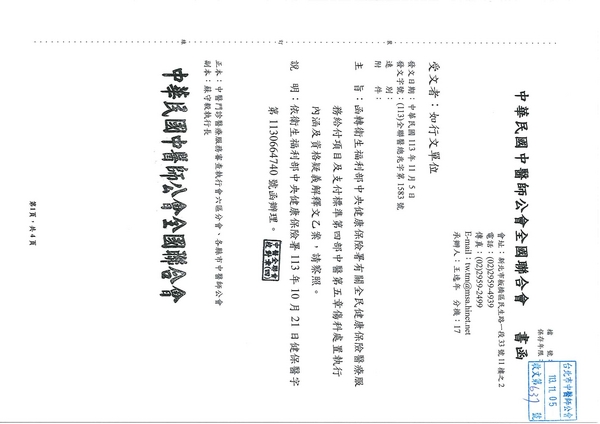 | 台北市中医师公会 官网:http://www.tpcma.org.tw 地址:台北市中正区青岛西路11号3楼 E-mail:tp.cma@msa.hinet.net 电话:(02)2314-3456(代表号) 传真:(02)2314-8181 |