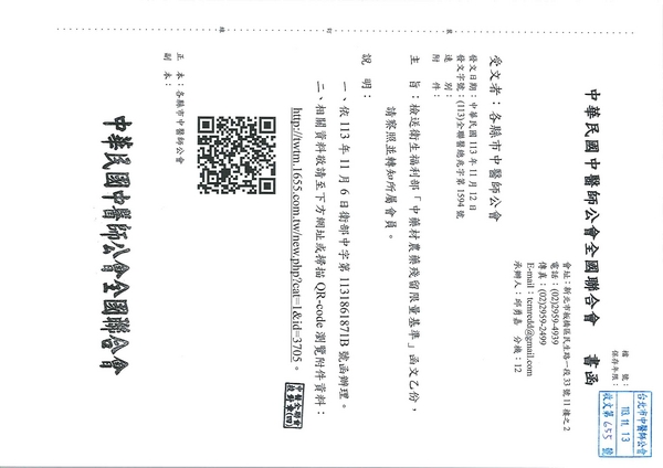 | 台北市中医师公会 官网:http://www.tpcma.org.tw 地址:台北市中正区青岛西路11号3楼 E-mail:tp.cma@msa.hinet.net 电话:(02)2314-3456(代表号) 传真:(02)2314-8181 |
