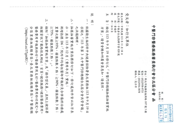 | 台北市中医师公会 官网:http://www.tpcma.org.tw 地址:台北市中正区青岛西路11号3楼 E-mail:tp.cma@msa.hinet.net 电话:(02)2314-3456(代表号) 传真:(02)2314-8181 |