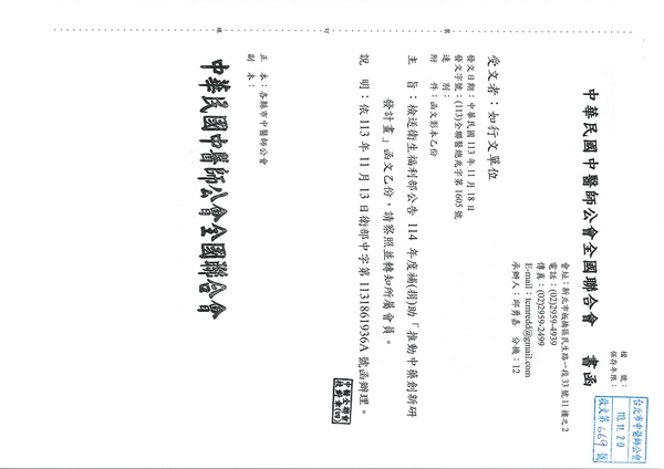 | 台北市中医师公会 官网:http://www.tpcma.org.tw 地址:台北市中正区青岛西路11号3楼 E-mail:tp.cma@msa.hinet.net 电话:(02)2314-3456(代表号) 传真:(02)2314-8181 |