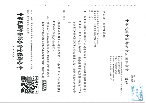 | 台北市中医师公会 官网:http://www.tpcma.org.tw 地址:台北市中正区青岛西路11号3楼 E-mail:tp.cma@msa.hinet.net 电话:(02)2314-3456(代表号) 传真:(02)2314-8181 |