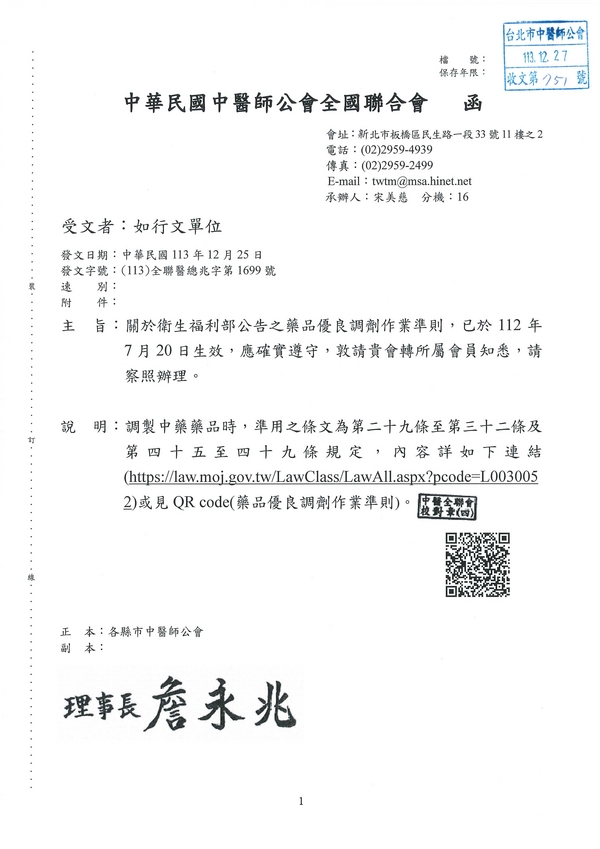 | 台北市中医师公会 官网:http://www.tpcma.org.tw 地址:台北市中正区青岛西路11号3楼 E-mail:tp.cma@msa.hinet.net 电话:(02)2314-3456(代表号) 传真:(02)2314-8181 |