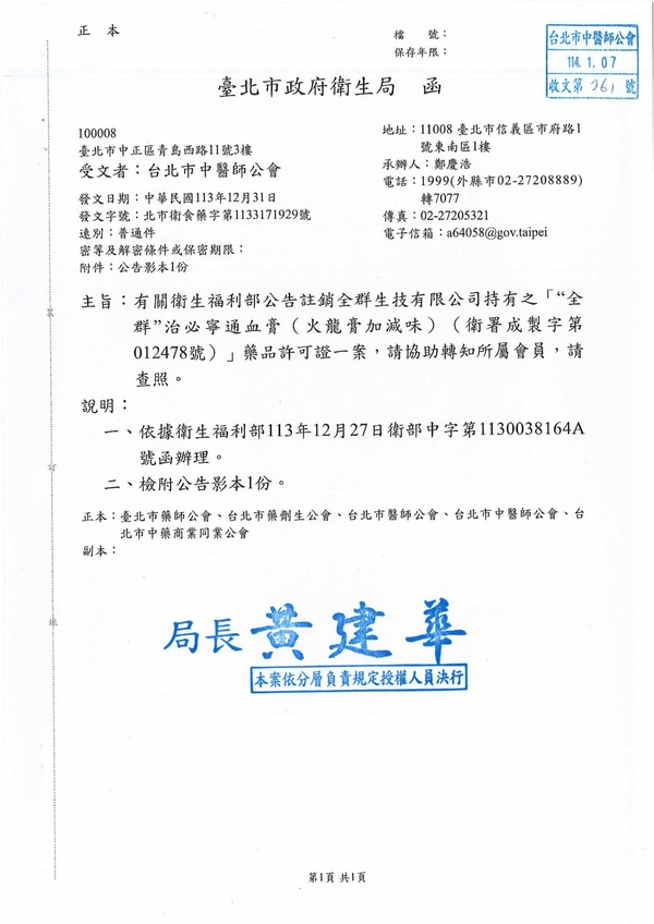 | 台北市中医师公会 官网:http://www.tpcma.org.tw 地址:台北市中正区青岛西路11号3楼 E-mail:tp.cma@msa.hinet.net 电话:(02)2314-3456(代表号) 传真:(02)2314-8181 |