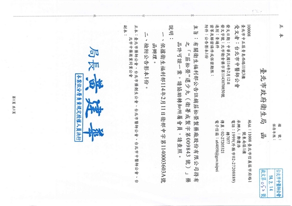 | 台北市中医师公会 官网:http://www.tpcma.org.tw 地址:台北市中正区青岛西路11号3楼 E-mail:tp.cma@msa.hinet.net 电话:(02)2314-3456(代表号) 传真:(02)2314-8181 |