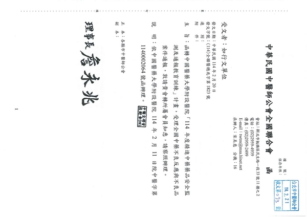 | 台北市中医师公会 官网:http://www.tpcma.org.tw 地址:台北市中正区青岛西路11号3楼 E-mail:tp.cma@msa.hinet.net 电话:(02)2314-3456(代表号) 传真:(02)2314-8181 |