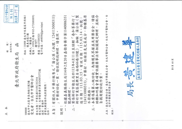 | 台北市中医师公会 官网:http://www.tpcma.org.tw 地址:台北市中正区青岛西路11号3楼 E-mail:tp.cma@msa.hinet.net 电话:(02)2314-3456(代表号) 传真:(02)2314-8181 |