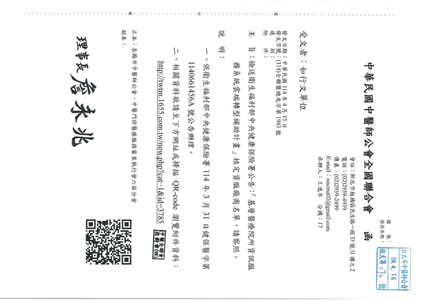 | 台北市中医师公会 官网:http://www.tpcma.org.tw 地址:台北市中正区青岛西路11号3楼 E-mail:tp.cma@msa.hinet.net 电话:(02)2314-3456(代表号) 传真:(02)2314-8181 |