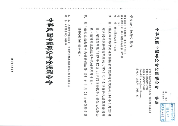 | 台北市中医师公会 官网:http://www.tpcma.org.tw 地址:台北市中正区青岛西路11号3楼 E-mail:tp.cma@msa.hinet.net 电话:(02)2314-3456(代表号) 传真:(02)2314-8181 |
