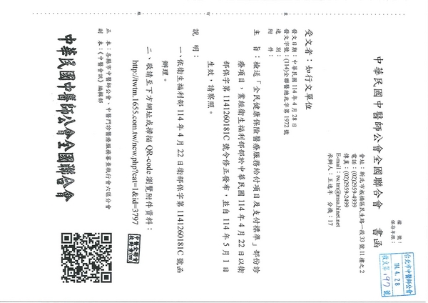 | 台北市中医师公会 官网:http://www.tpcma.org.tw 地址:台北市中正区青岛西路11号3楼 E-mail:tp.cma@msa.hinet.net 电话:(02)2314-3456(代表号) 传真:(02)2314-8181 |