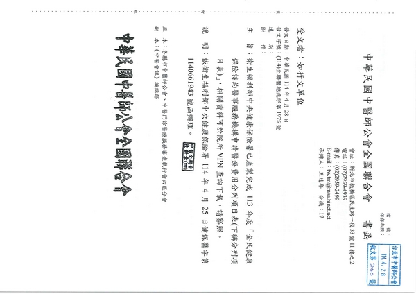 | 台北市中医师公会 官网:http://www.tpcma.org.tw 地址:台北市中正区青岛西路11号3楼 E-mail:tp.cma@msa.hinet.net 电话:(02)2314-3456(代表号) 传真:(02)2314-8181 |