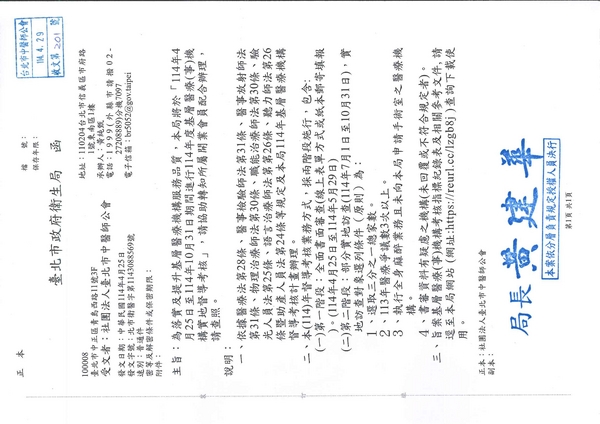 | 台北市中医师公会 官网:http://www.tpcma.org.tw 地址:台北市中正区青岛西路11号3楼 E-mail:tp.cma@msa.hinet.net 电话:(02)2314-3456(代表号) 传真:(02)2314-8181 |