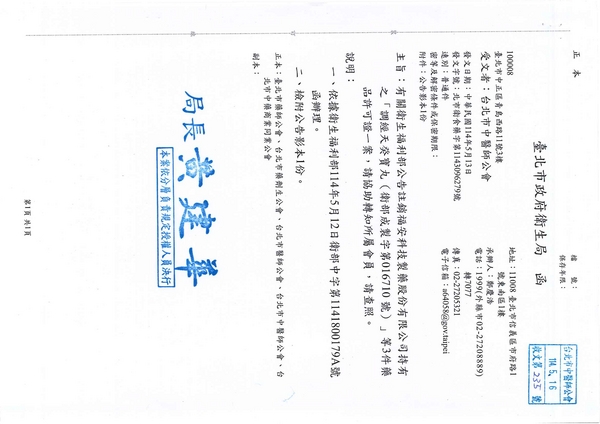 | 台北市中医师公会 官网:http://www.tpcma.org.tw 地址:台北市中正区青岛西路11号3楼 E-mail:tp.cma@msa.hinet.net 电话:(02)2314-3456(代表号) 传真:(02)2314-8181 |